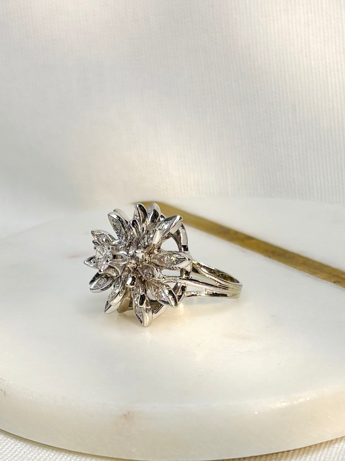 Style: An Estate ring not for the faint of heart. This diamond flower ring is a true showstopper!!! This ring is a size 5 1/2 and is approx. 22mm across.