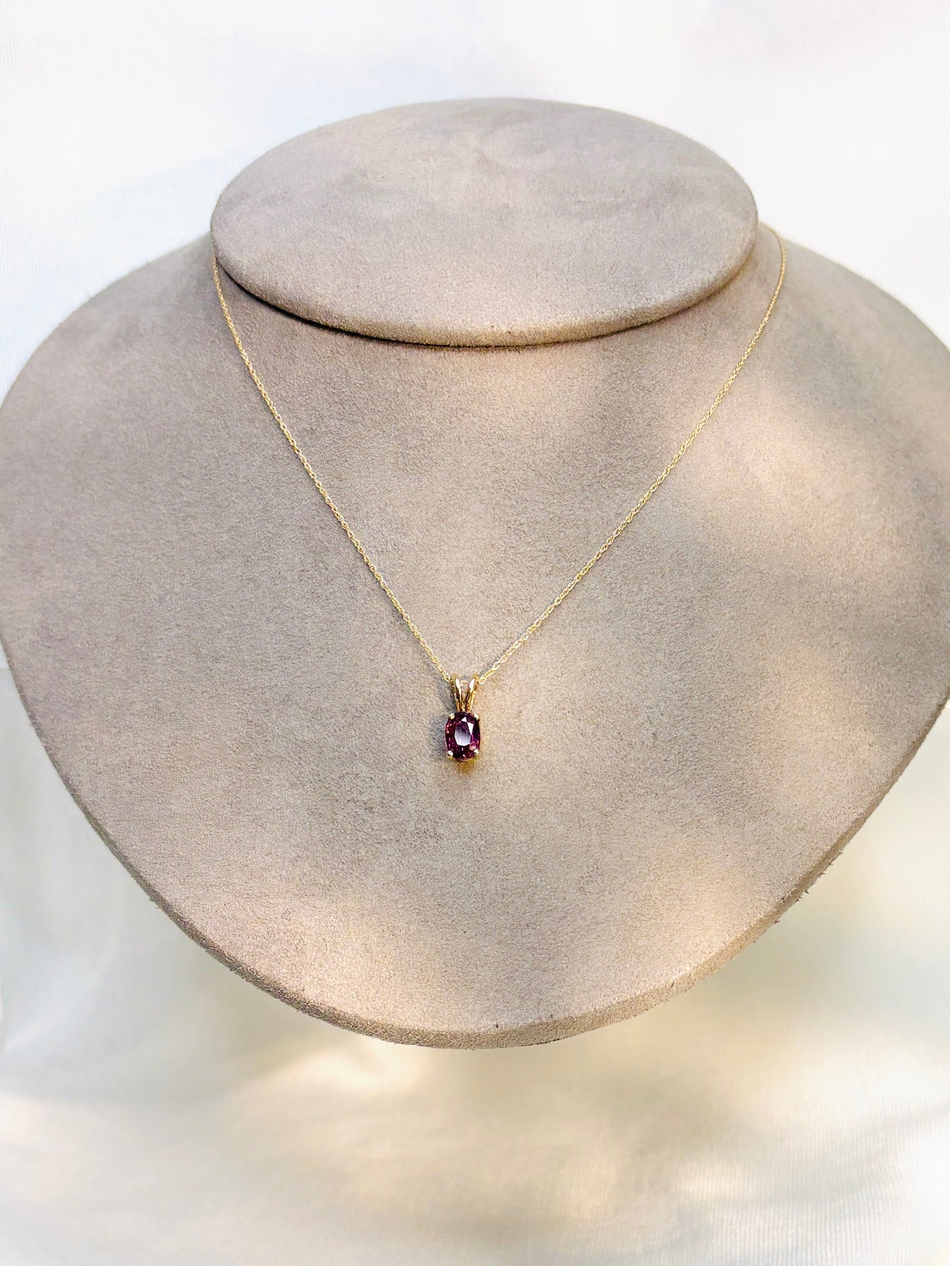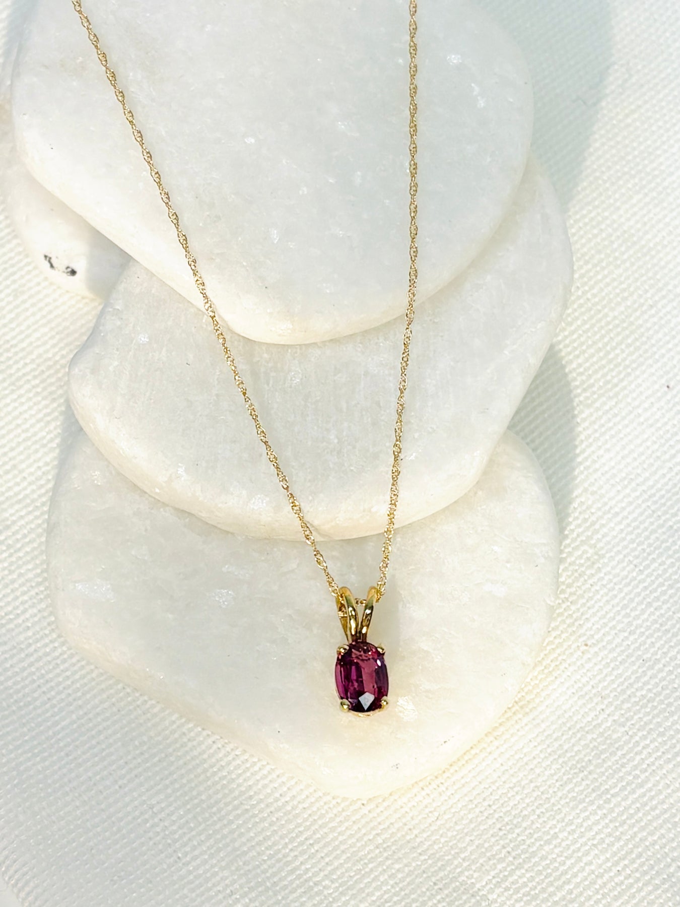 Style: A vintage prong-set ruby in a pink hue. Very unique! Adorning a new dainty sparkle rop chain, 18" length. Spring ring closure. Pendant measures approximately .5" x .38".