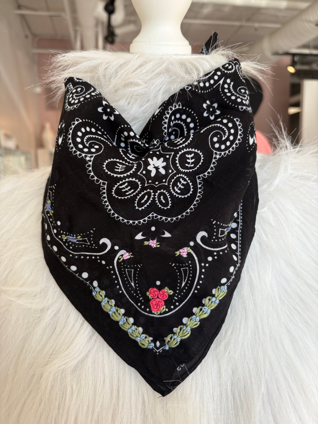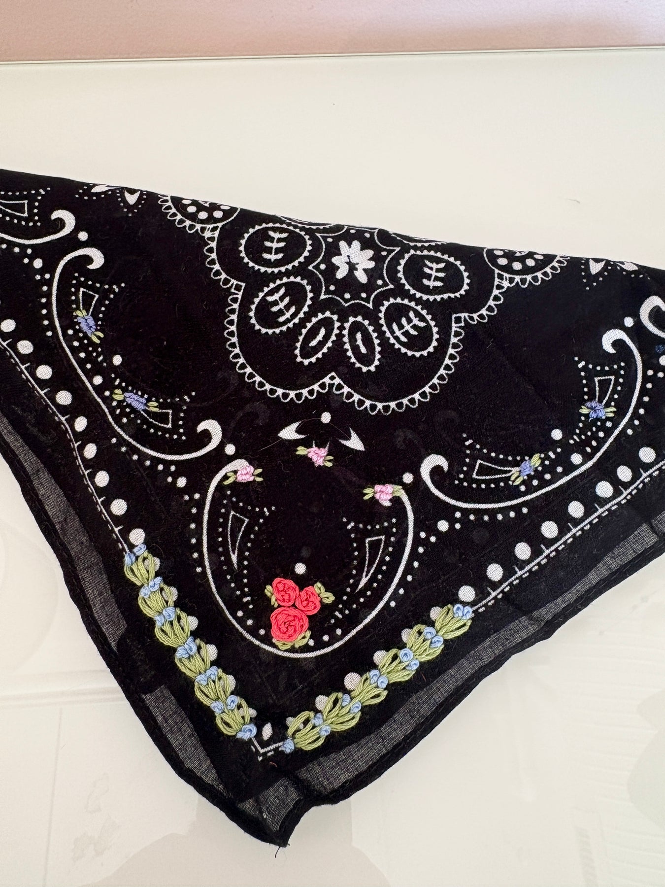 Style: Your traditional bandana with a sweet added touch: embroidered floral motif. Style this as a neck or head scarf, hair accessory or bag scarf. We love it any way you wear it! Super soft material. Bandana measures 21-3/4"W x 21-3/4"L.
