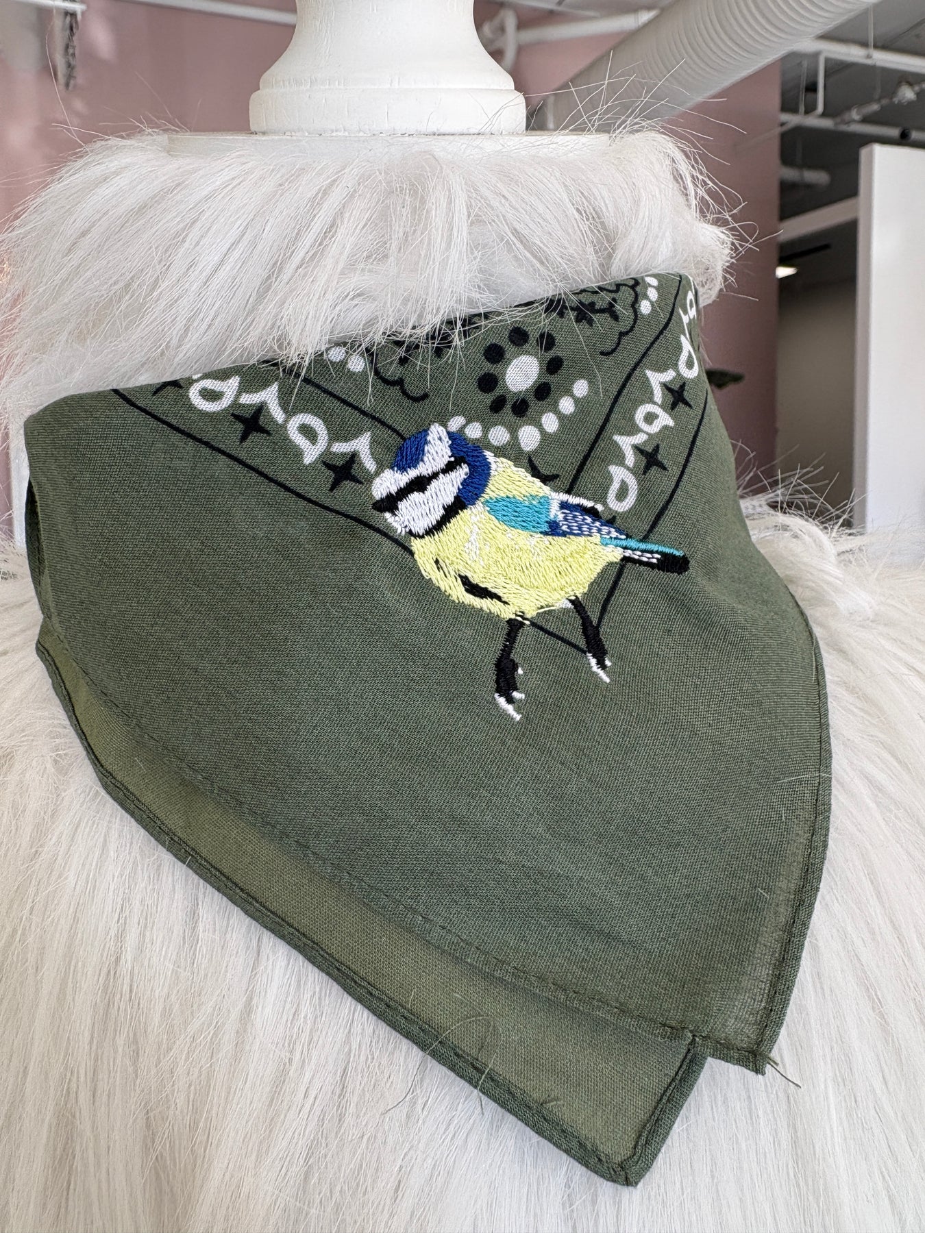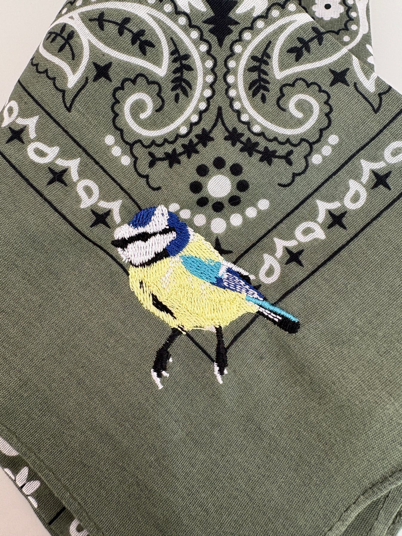 Style: Your traditional bandana with an extra touch: an embroidered bird. Great gifts for a group ("birds of a feather flock together"), or a little something sweet for the birder in your life. Super soft material. Bandana measures 21-3/4"W x 21-3/4"L.