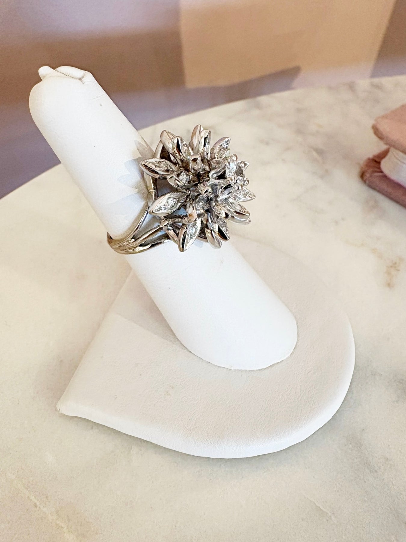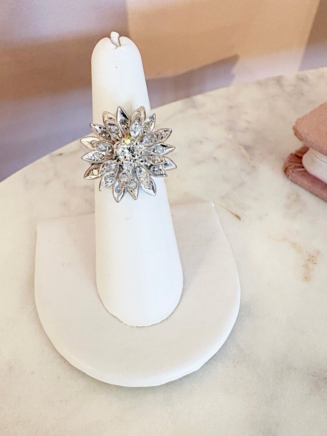 Style: An Estate ring not for the faint of heart. This diamond flower ring is a true showstopper!!! This ring is a size 5 1/2 and is approx. 22mm across.