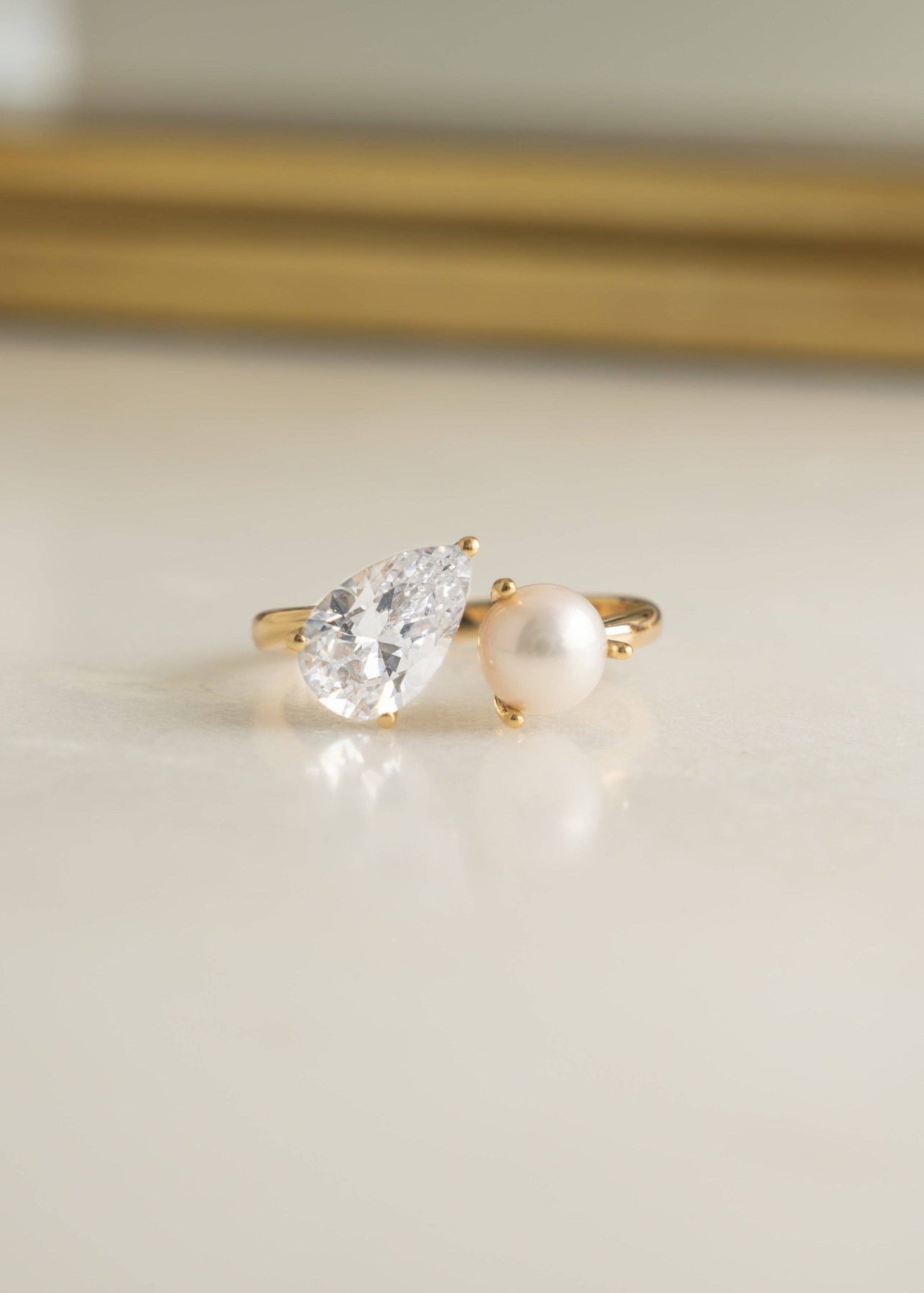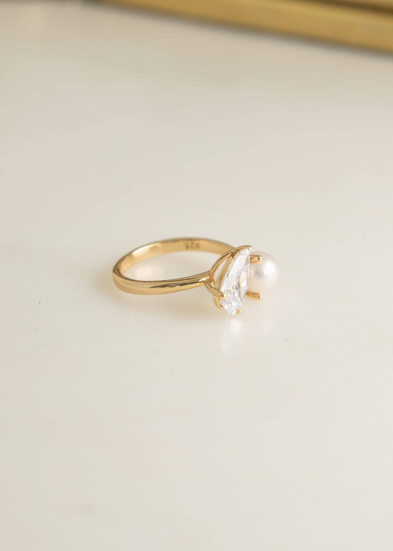 Style: The Toi et Moi Pearl Ring features a radiant pearl paired with a pear (teardrop shaped) stone. Translation is "you and me", symbolizing the unity of two people. Pear Stone: 5x7mm, Natural Fresh Water Pearl: 7mm. Size 7.