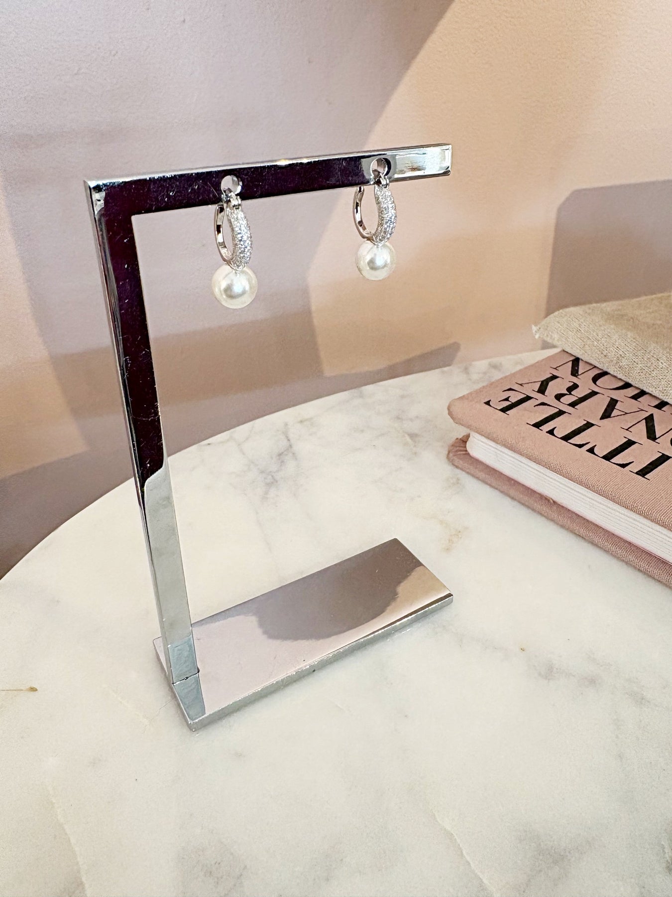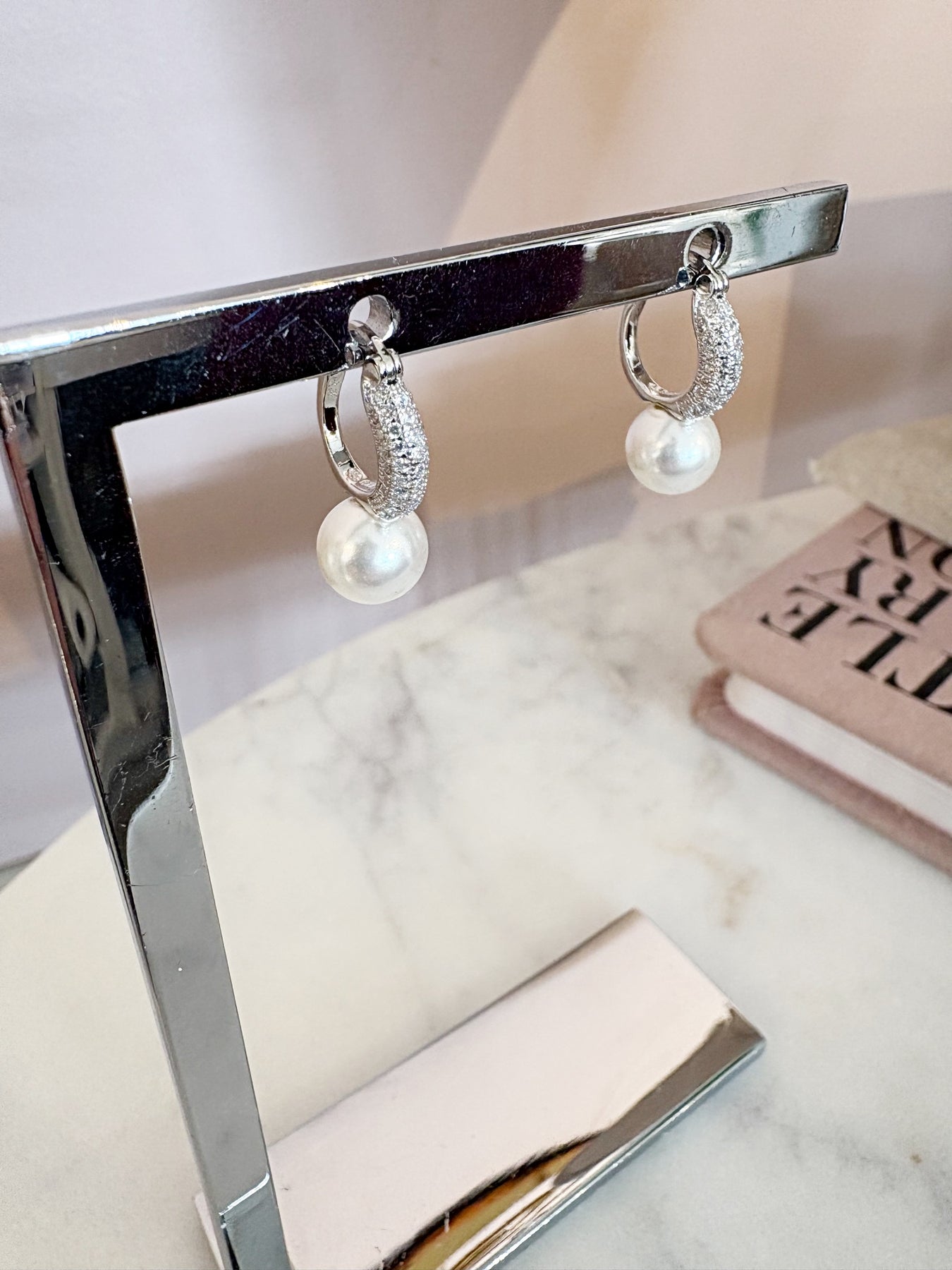 Style: Your classic pearl hoops with the sparkle turned all the way up! 8mm x 20mm size. .75" drop. Synthetic pearl 8mm, Crystals 1mm. Saddleback closure.