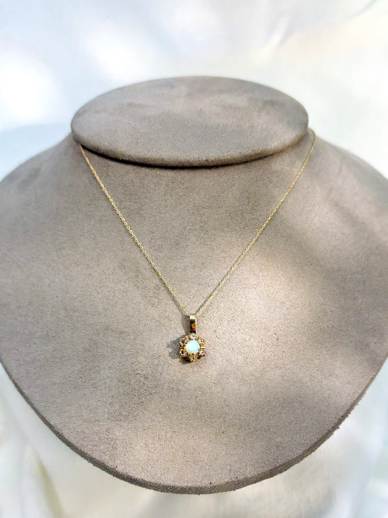 Style: A feminine touch for your necklace stack! A dreamy opal is surrounded by diamonds to make up a vintage pendant. Adorning a new sparkle rope chain, which catches the light with movement. We love this one worn alone or layered with other gold chains for a bolder look. Pendant measures approximately .5" x .25". Chain is 18", spring ring closure.