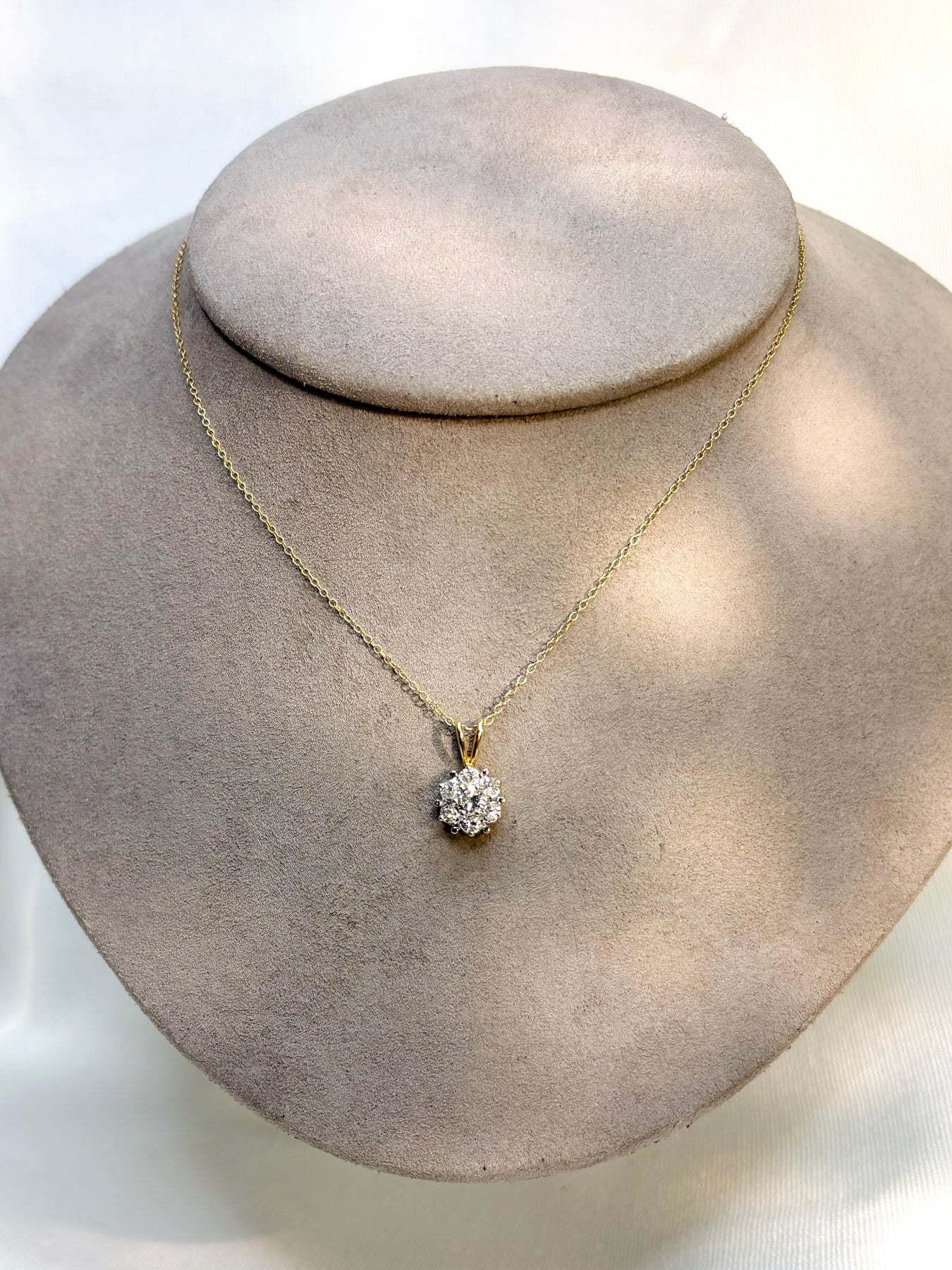 Style: A sparkly showstopper! A vintage diamond cluster adorns a new, dainty cable chain. Wear this with other gold chains for a bolder look, but it makes a major statement all on its own. Pendant measures approximately .25" diameter. Chain is 15", spring ring closure.