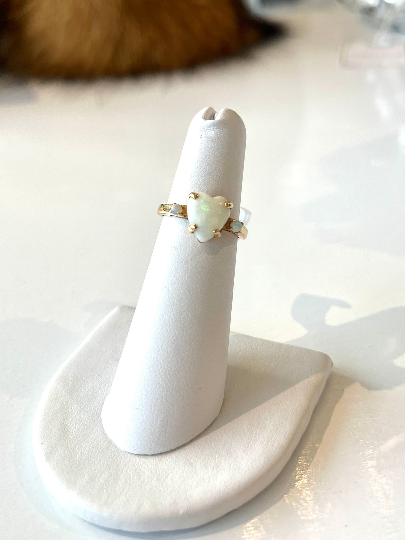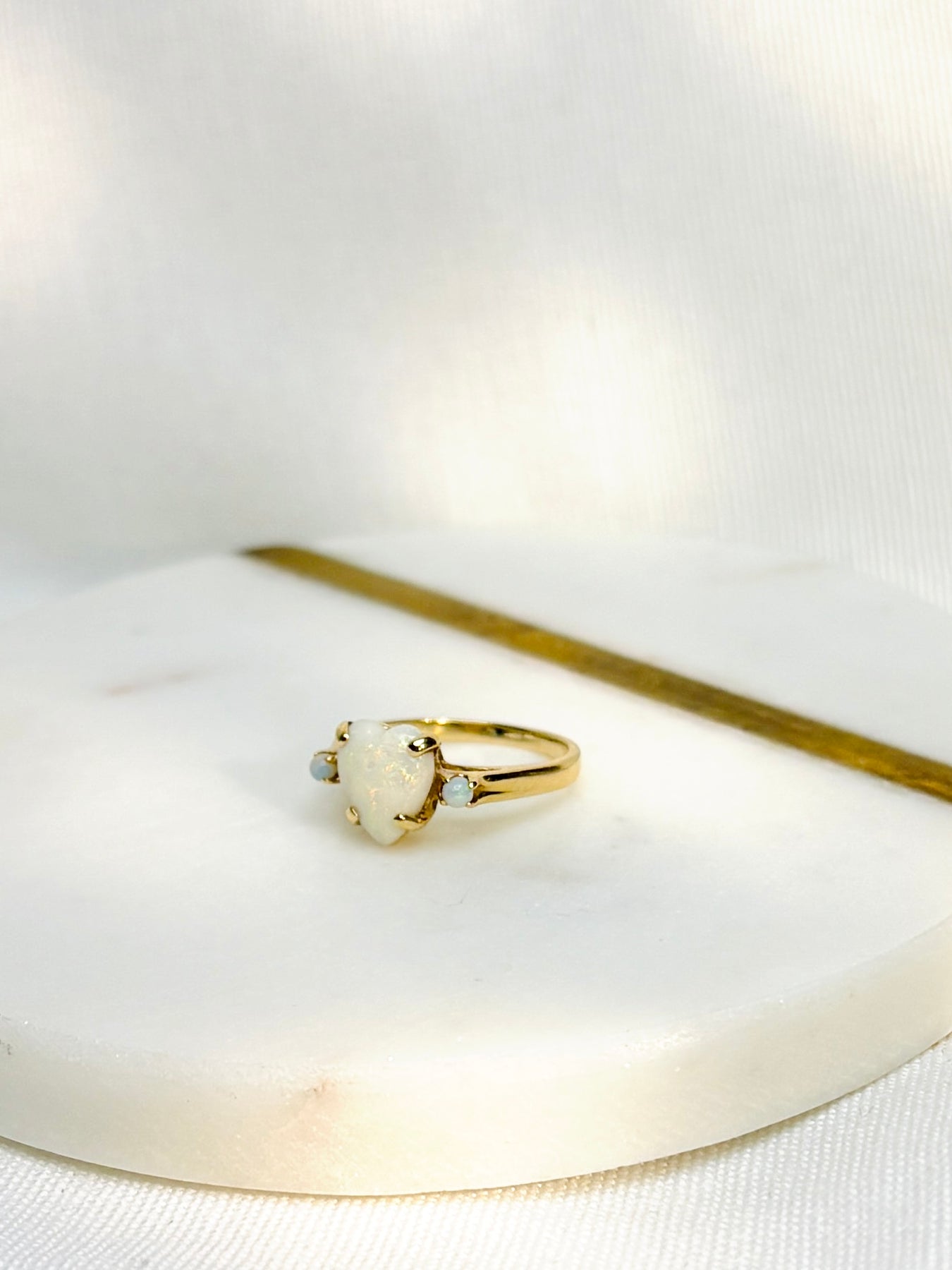 Style: A sweet little vintage piece to add to your ring stack. An opal trio featuring a large heart. Setting measures approx 9mm x 14mm. Ring size 4.75, 2mm band thickness.