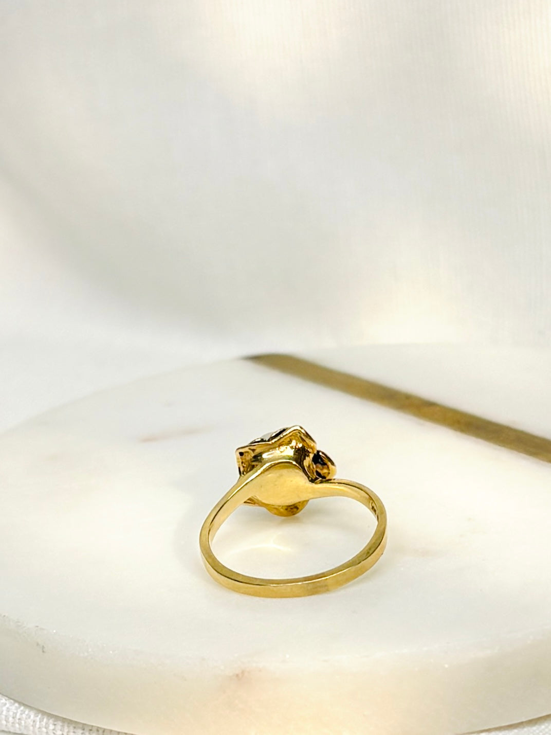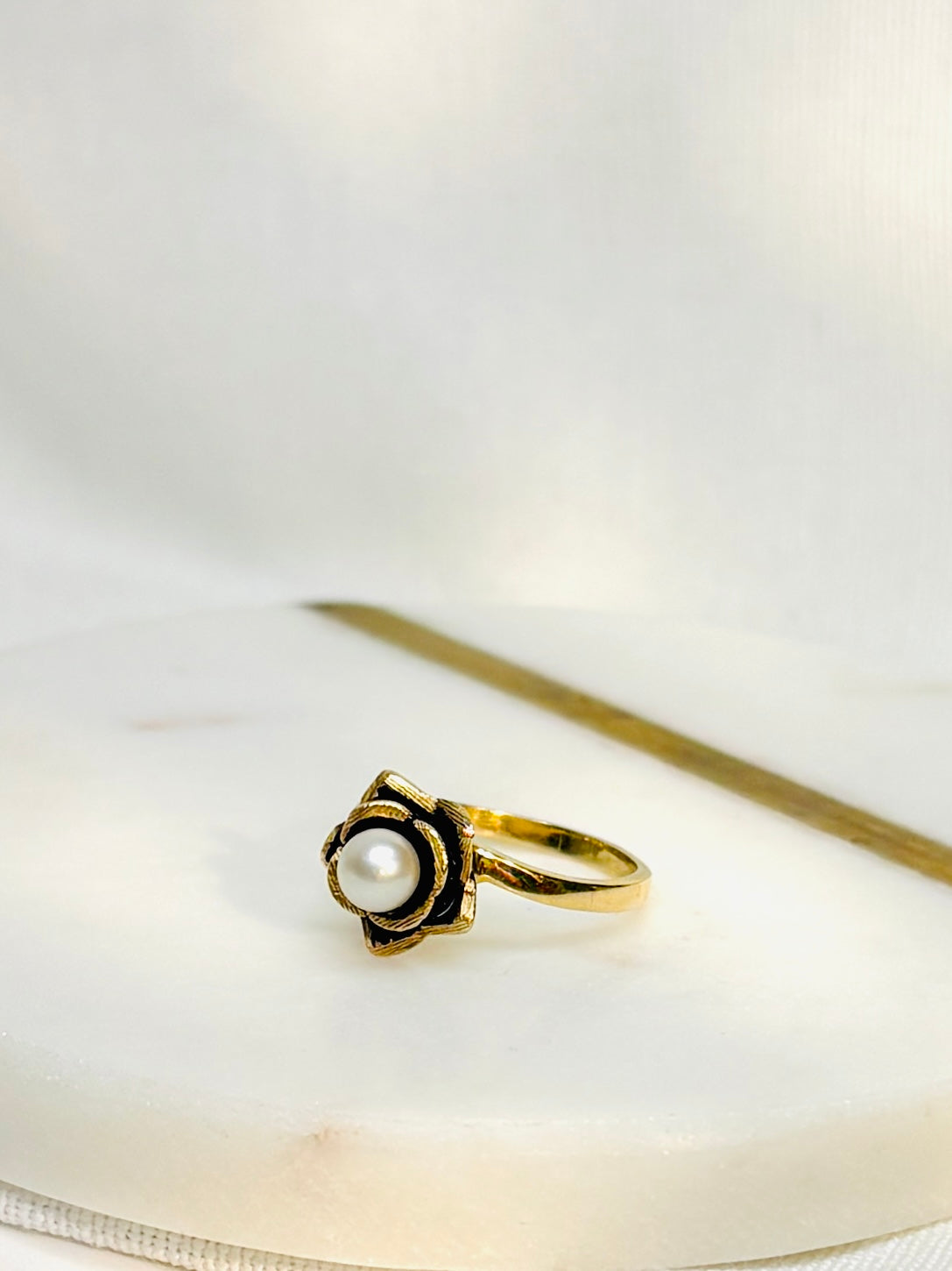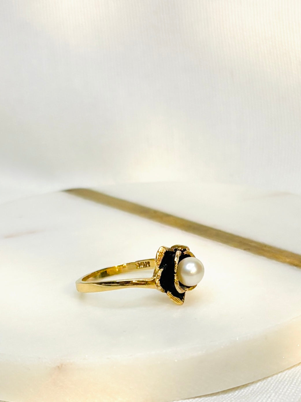 Style: A vintage beauty to add to your ring stack. Layers well with others, or wear it solo for a sweet touch to your look. A prominent pearl sits inside a 14kt flower setting with black accents. Measures approx 11mm diameter. Ring size 7.5, 2.5mm band thickness.