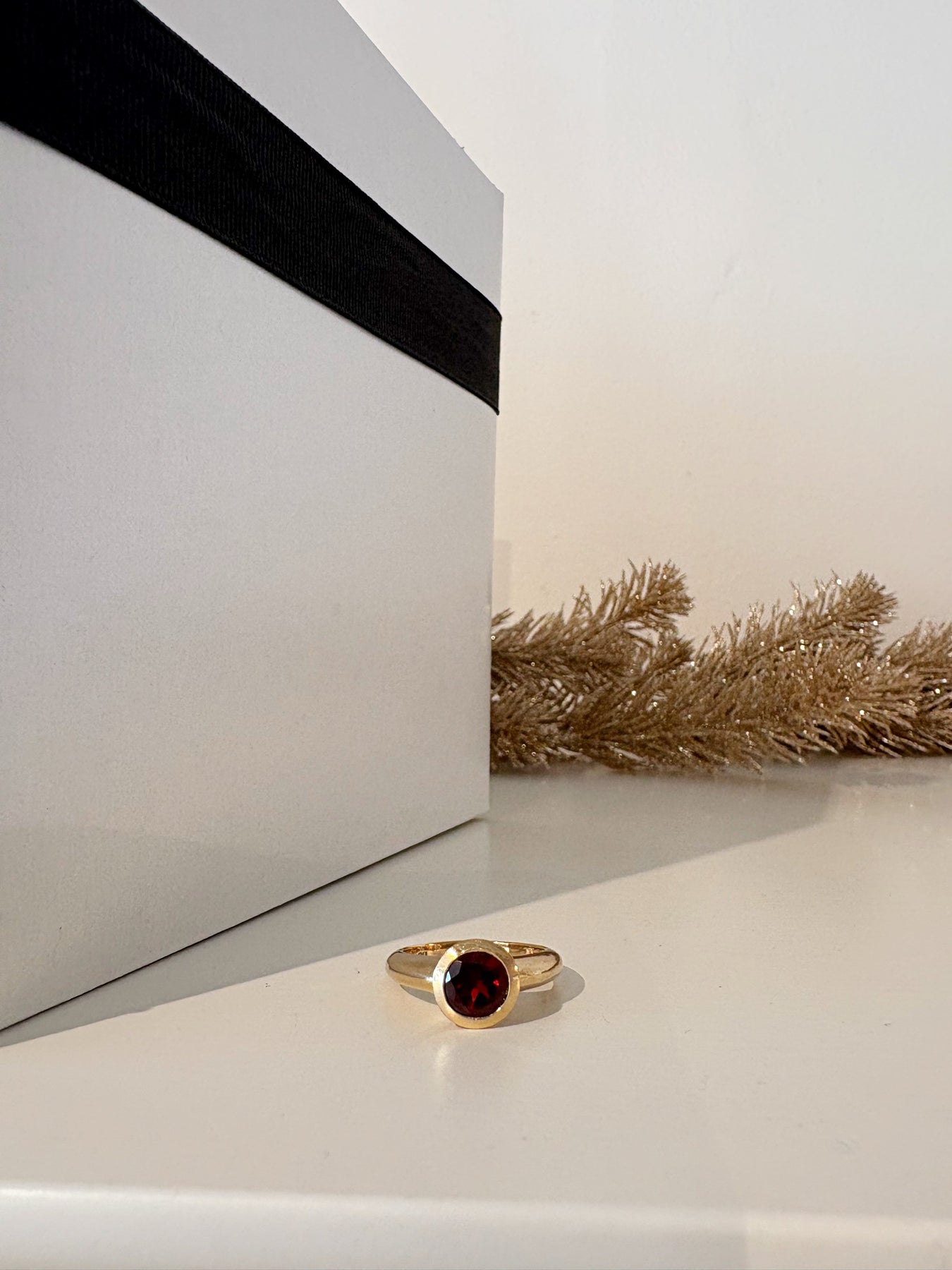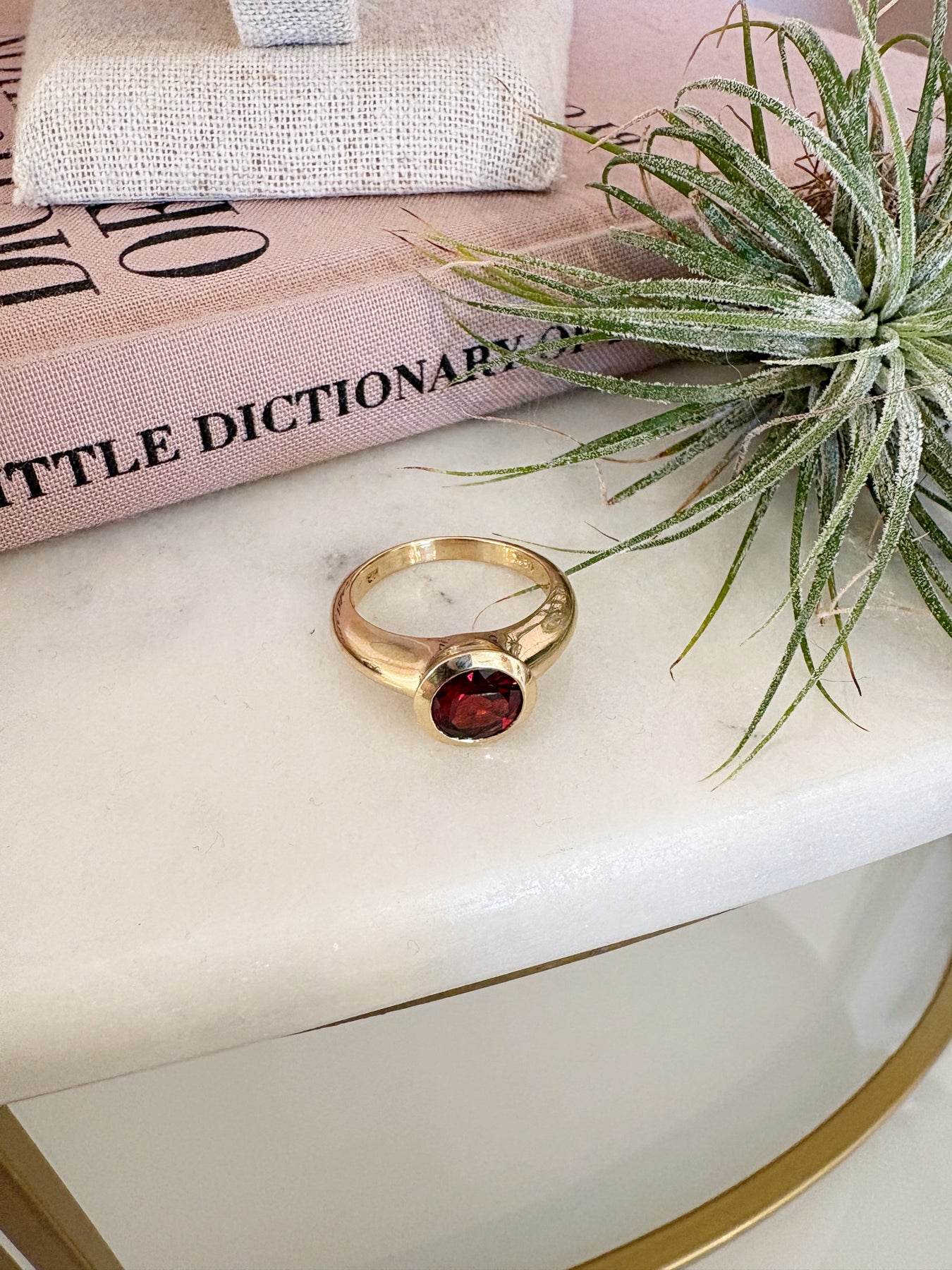 Style: A moody scarlet red faux stone is set in a hefty gold setting, making this ring a statement! This ring is a size 7.