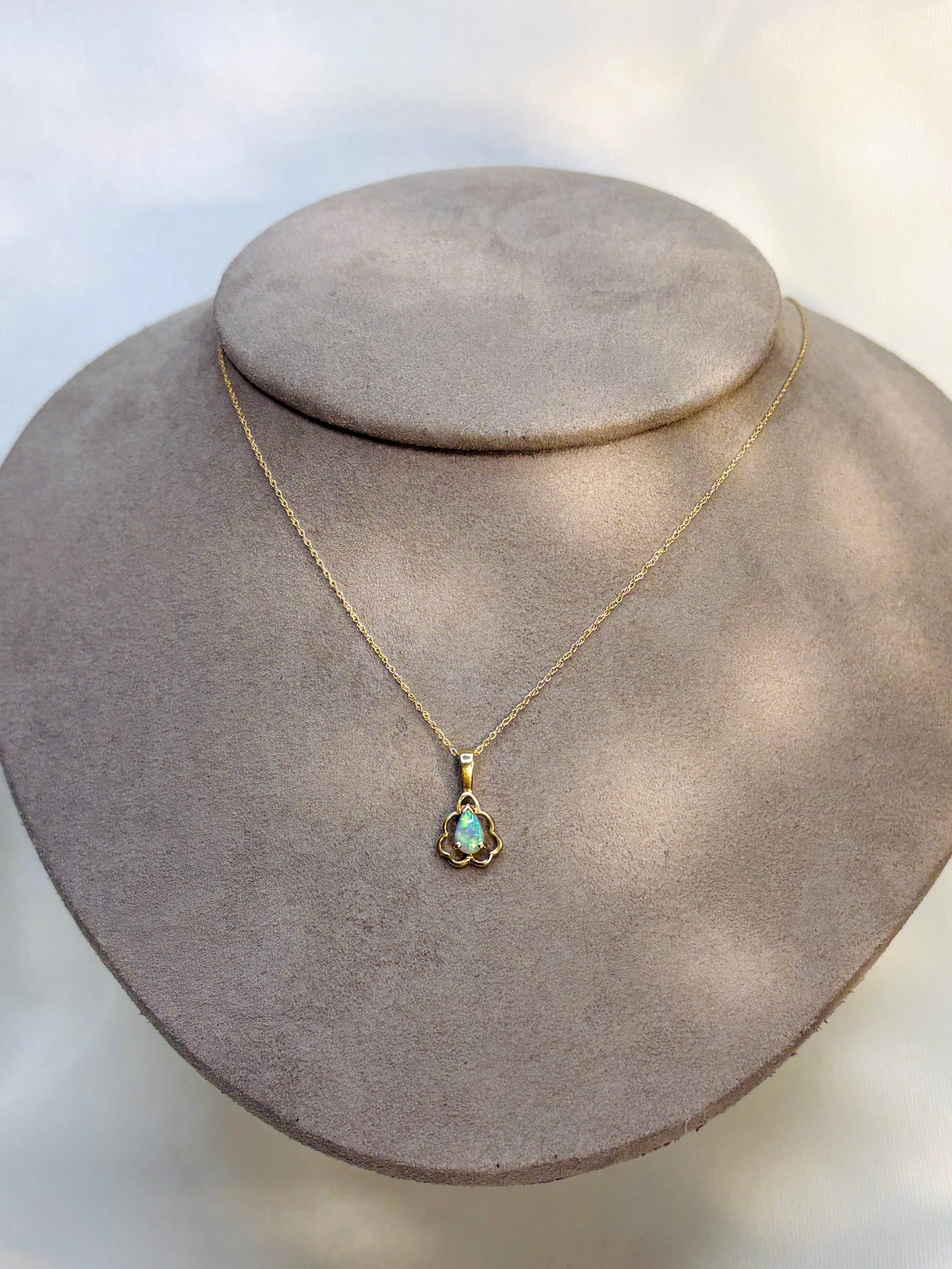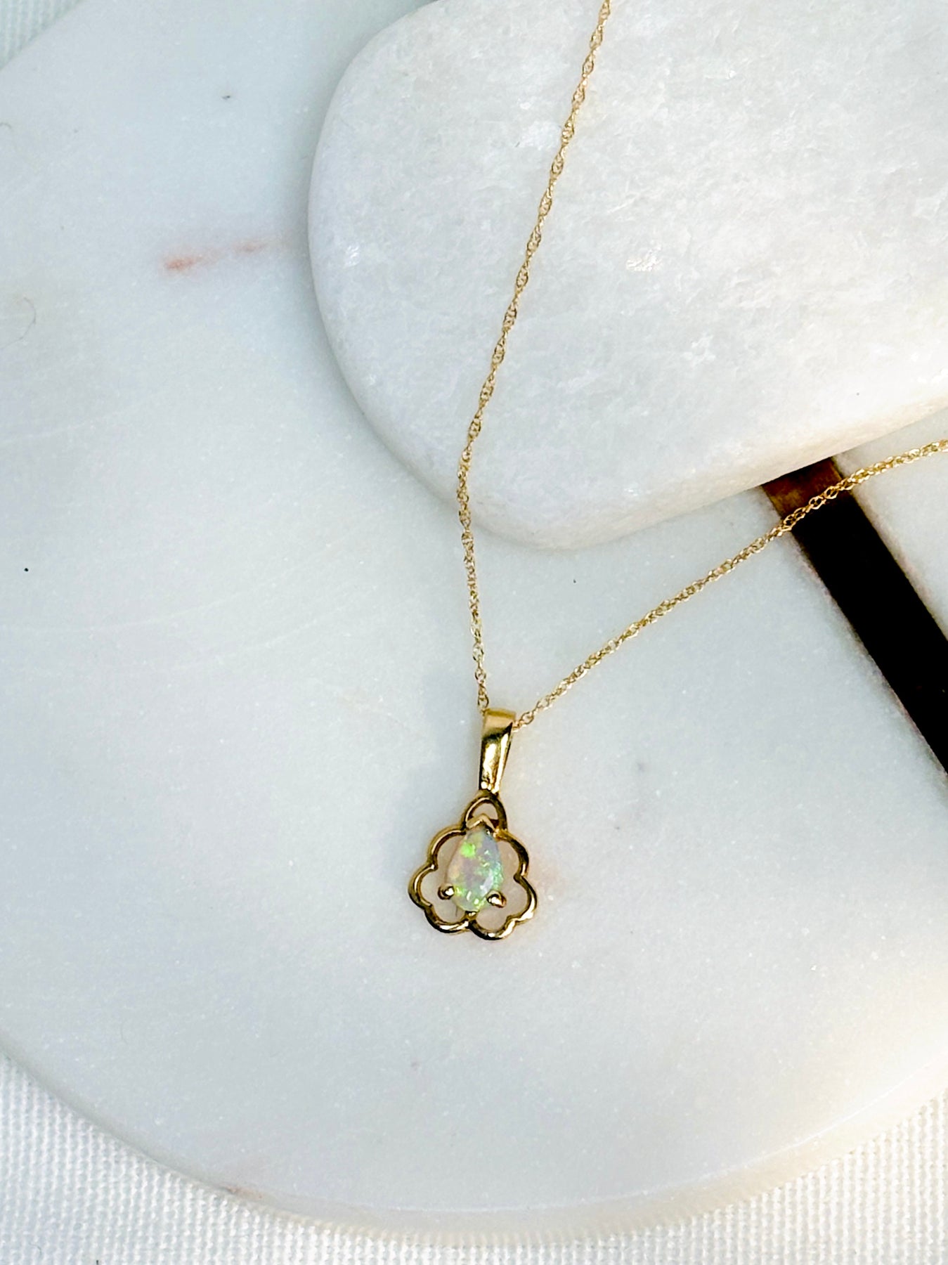 Style: A vintage beaut! A teardrop-shaped opal with gold accent adorns a new sparkle rope chain. Gorgeous in the light and looks great solo or layered with other pieces. Pendant measures approximately .5" x .38". 18" chain length, spring ring closure.