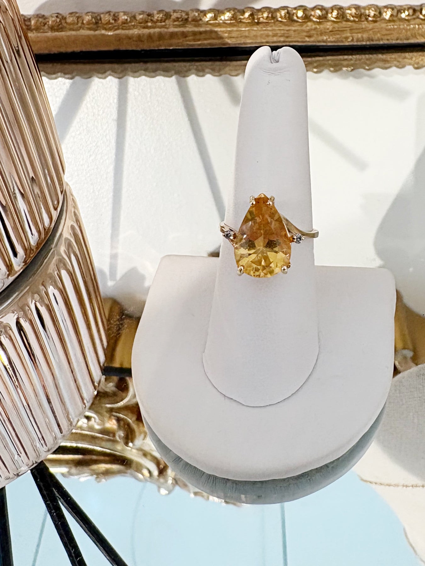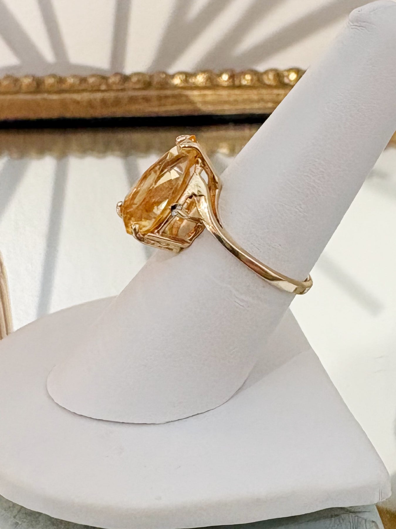 Style: Sunshine on your finger! This 10k gold estate ring features a striking citrine in a flattering elongated silhouette, framed by a classic gold setting sprinkled with diamonds. Bold yet refined, it's the perfect statement ring -- beautiful worn alone or layered with other favorites. Warm sparkle, timeless style!