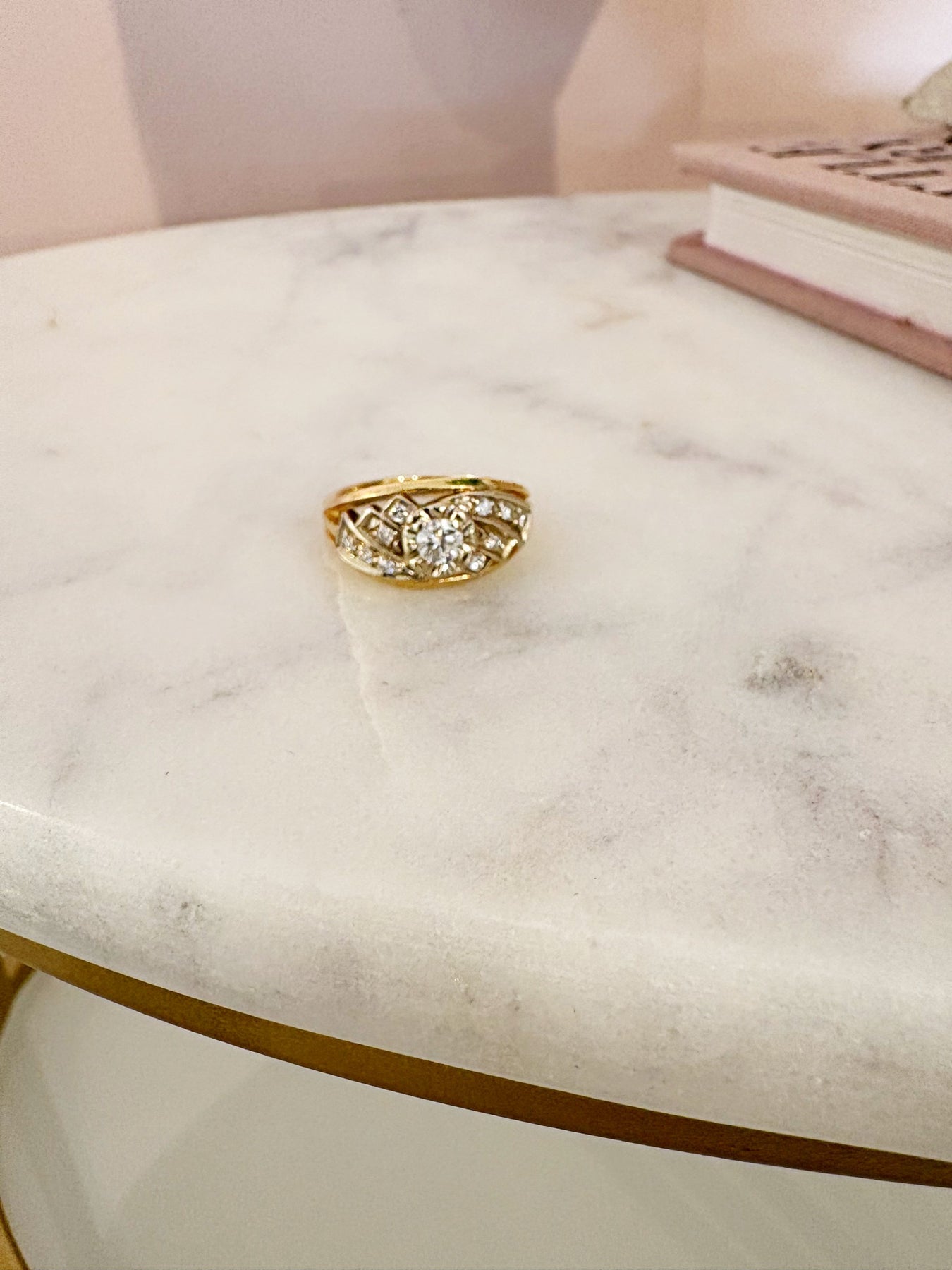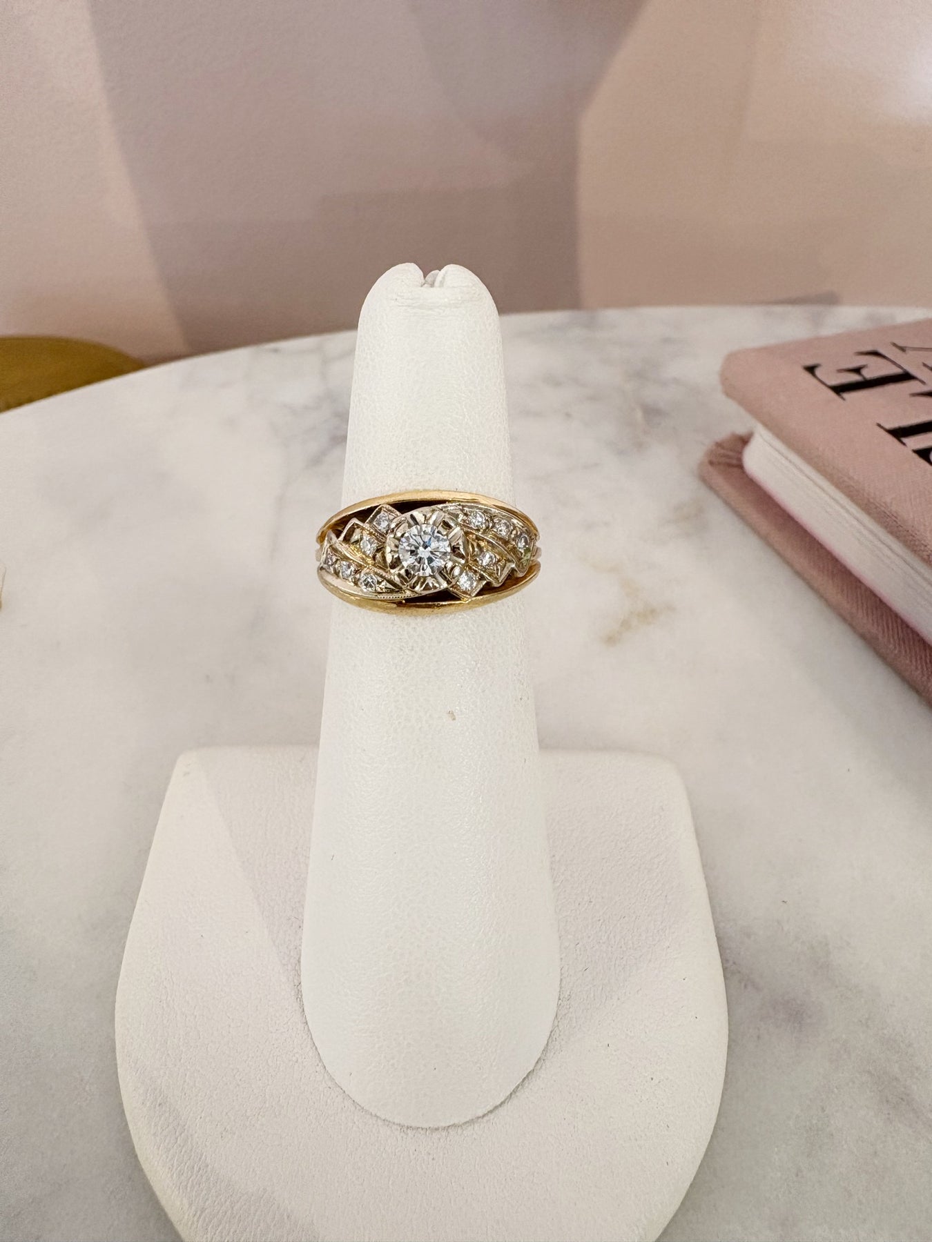 Diamonds arranged in a swirl around a larger stone with gold accents makes a beautiful vintage piece. Gorgeous enough for special occasions, but great for everyday wear. Ring size 5.25. Face measures approximately 10mm x 18mm.