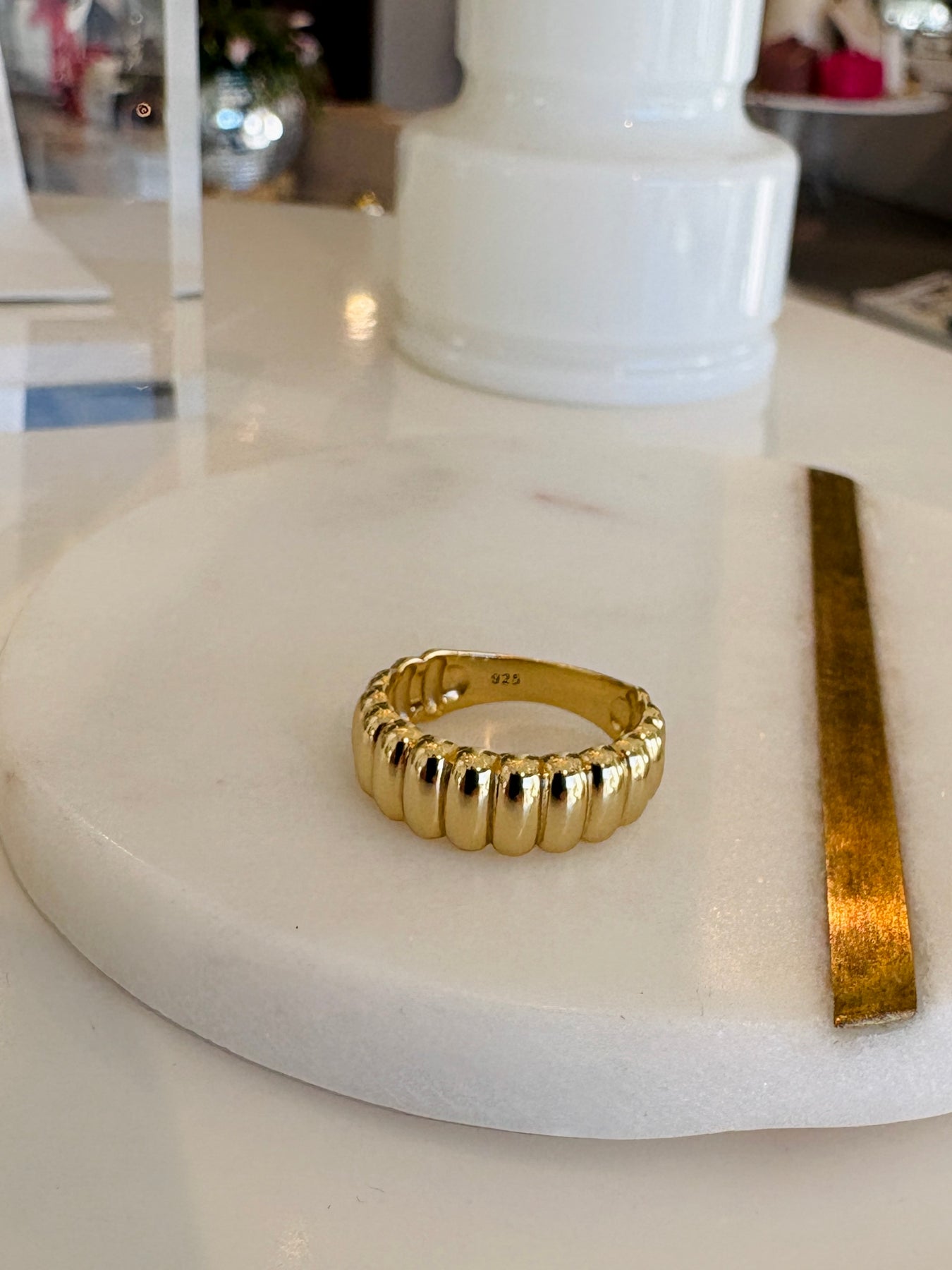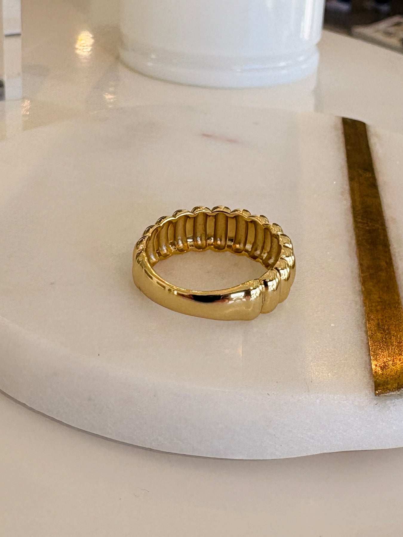 Style: The ribbed, fluted detailing on this statement ring makes it so unique and chic! It's great on its own, but also pairs nicely with other rings. .5" thickness.