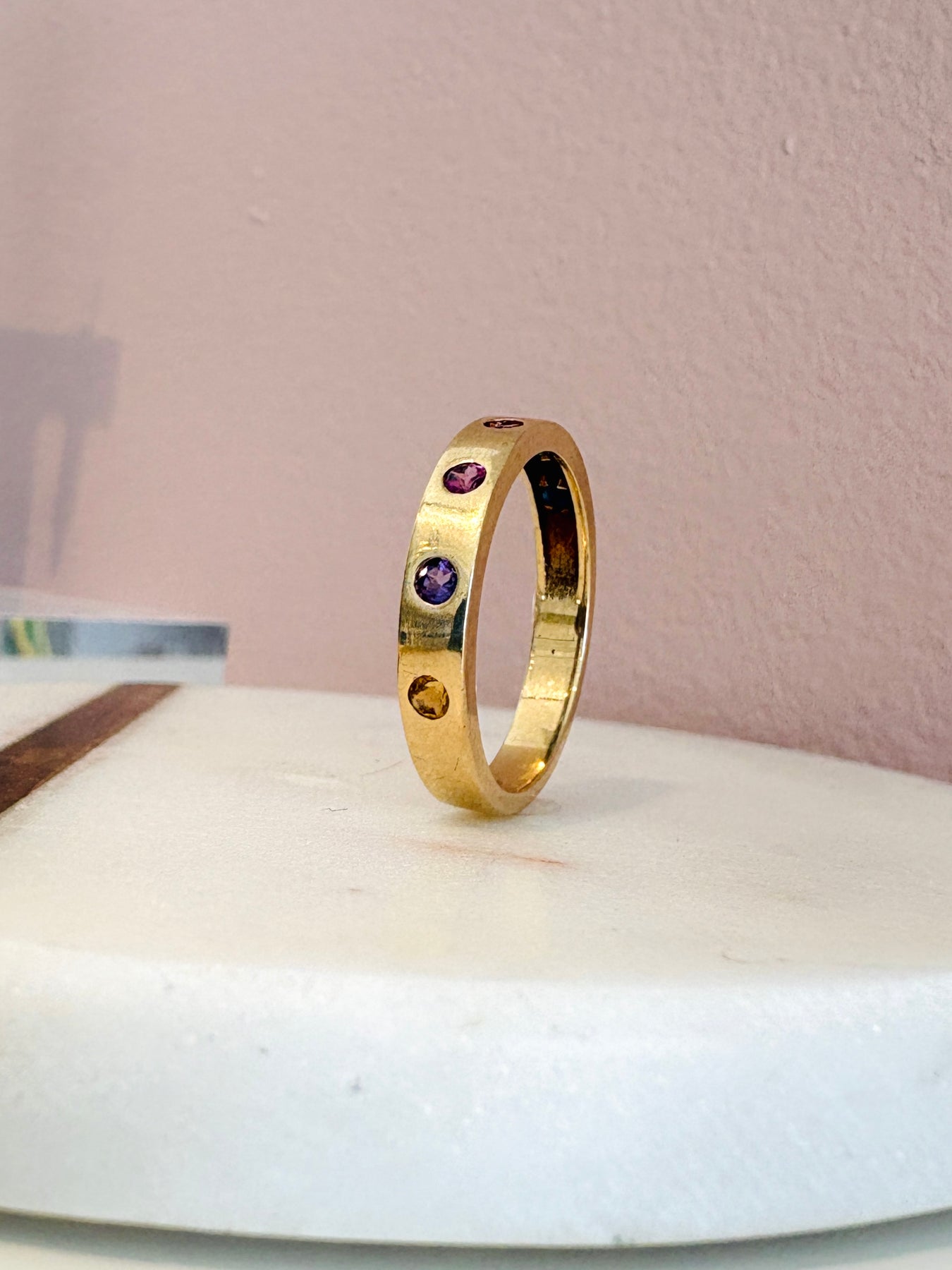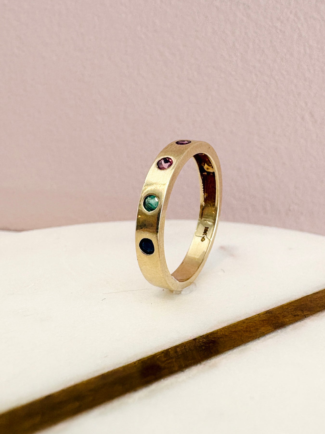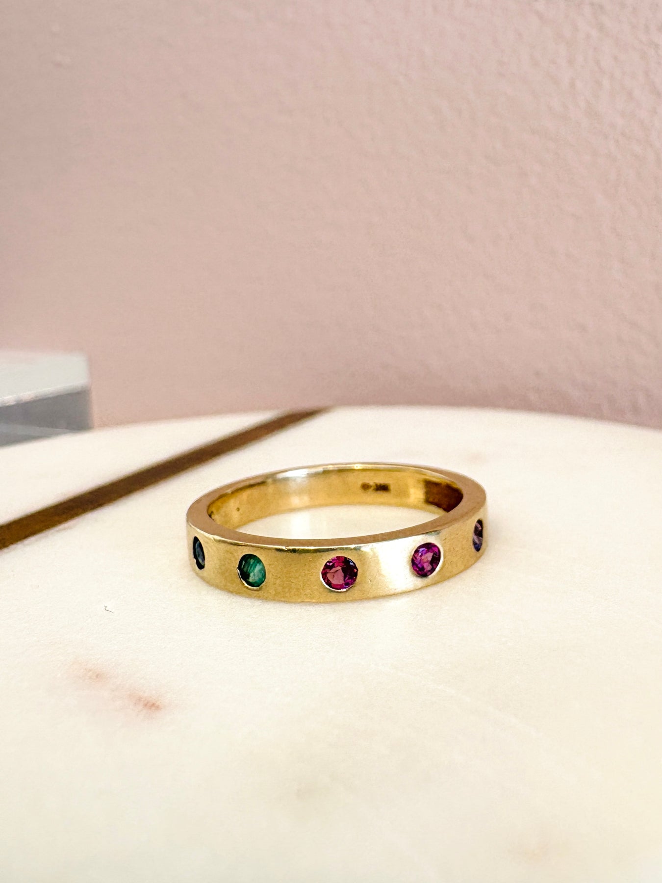 Style: A simple, vintage band featuring an array of gemstones. 4mm band thickness. Ring size 9.