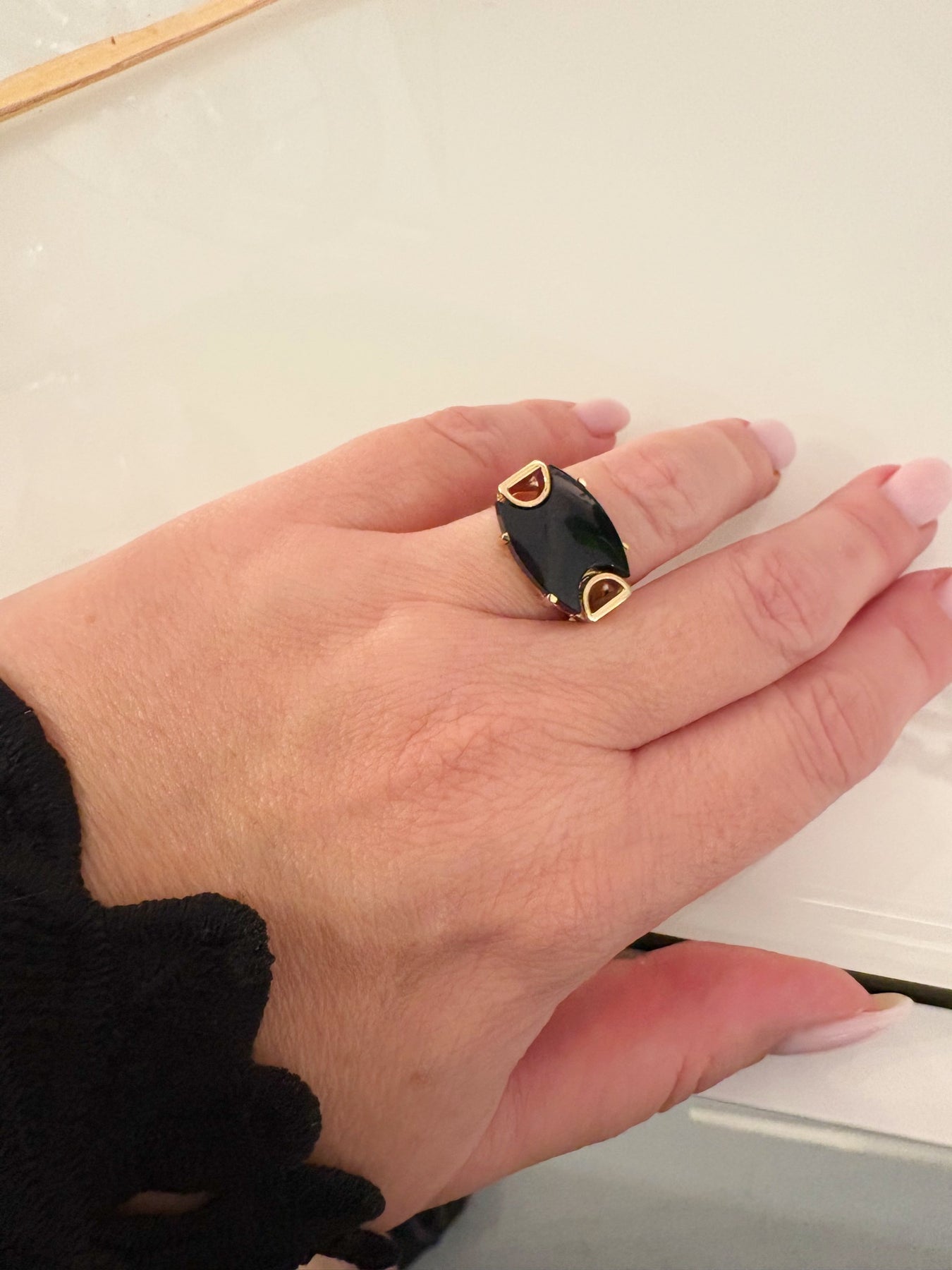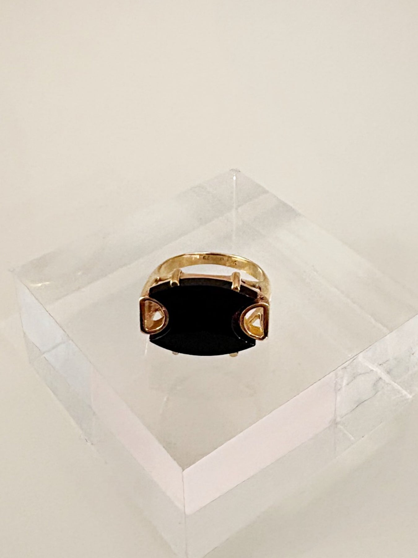 Style: Bold, sleek, and just a little bit dramatic. This vintage 10kt yellow gold cocktail ring features a glossy black onyx center framed gold accents. The contrast of inky black stone and warm gold gives it a timeless, glam feel—perfect for a night out or dressing up your everyday look. A standout vintage piece that wears like modern statement jewelry.