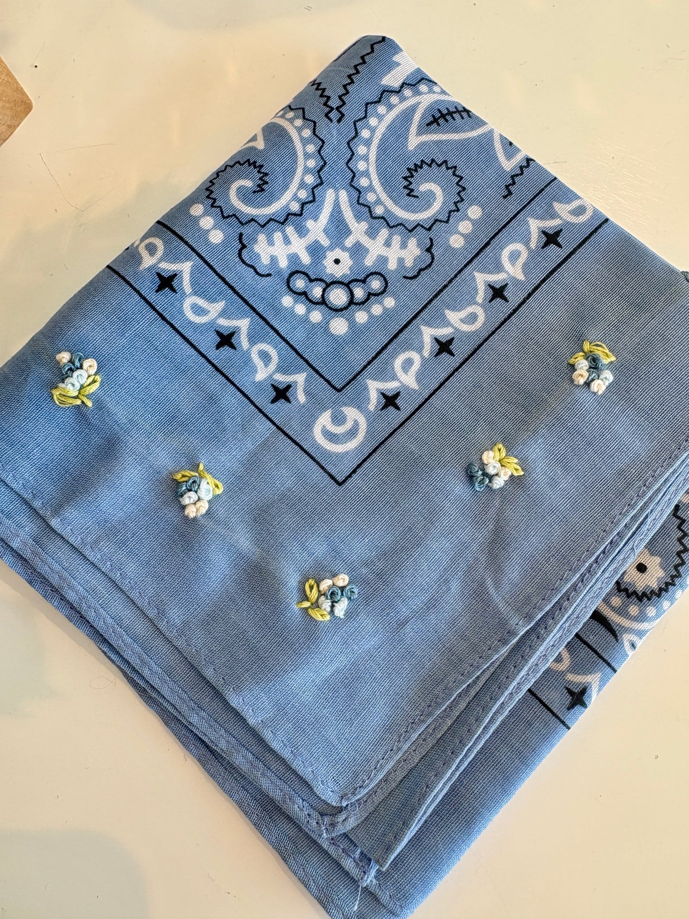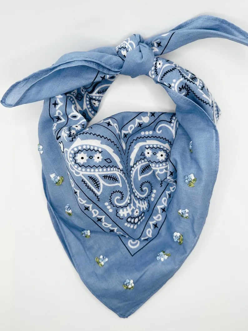 Style: Your traditional bandana with a sweet added touch: a dainty embroidered floral motif. Style this as a neck or head scarf, hair accessory or bag scarf. We love it any way you wear it! Super soft material. Bandana measures 21-3/4"W x 21-3/4"L.