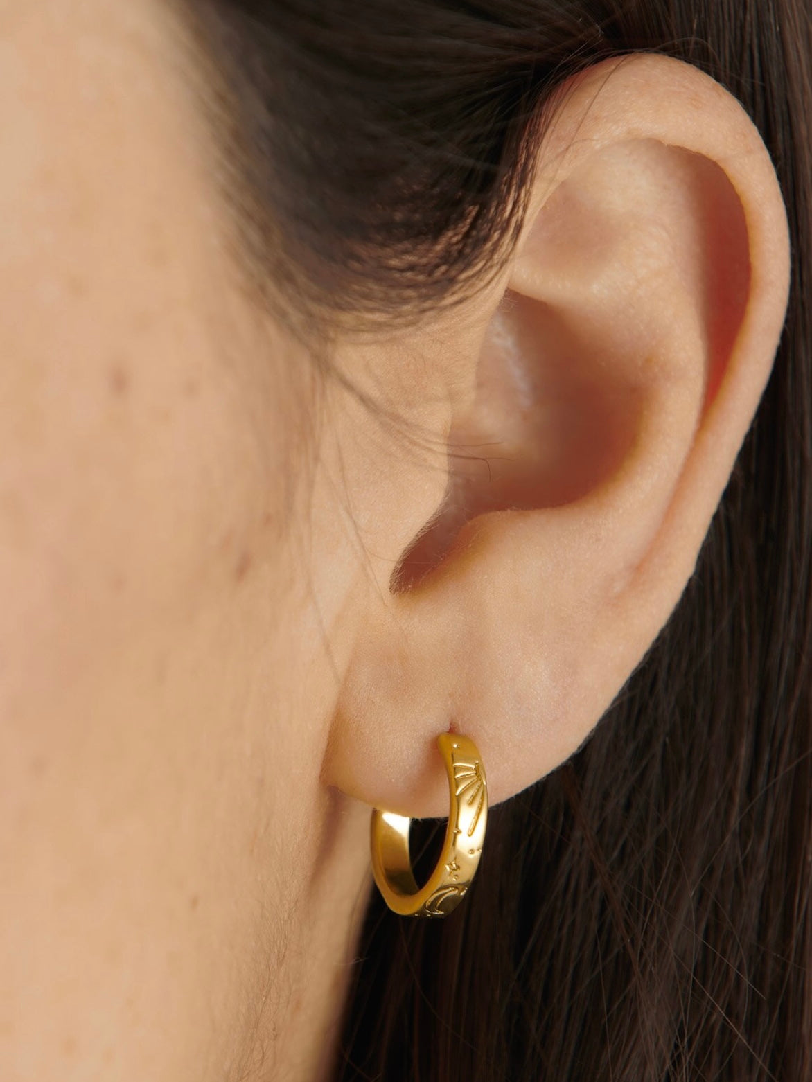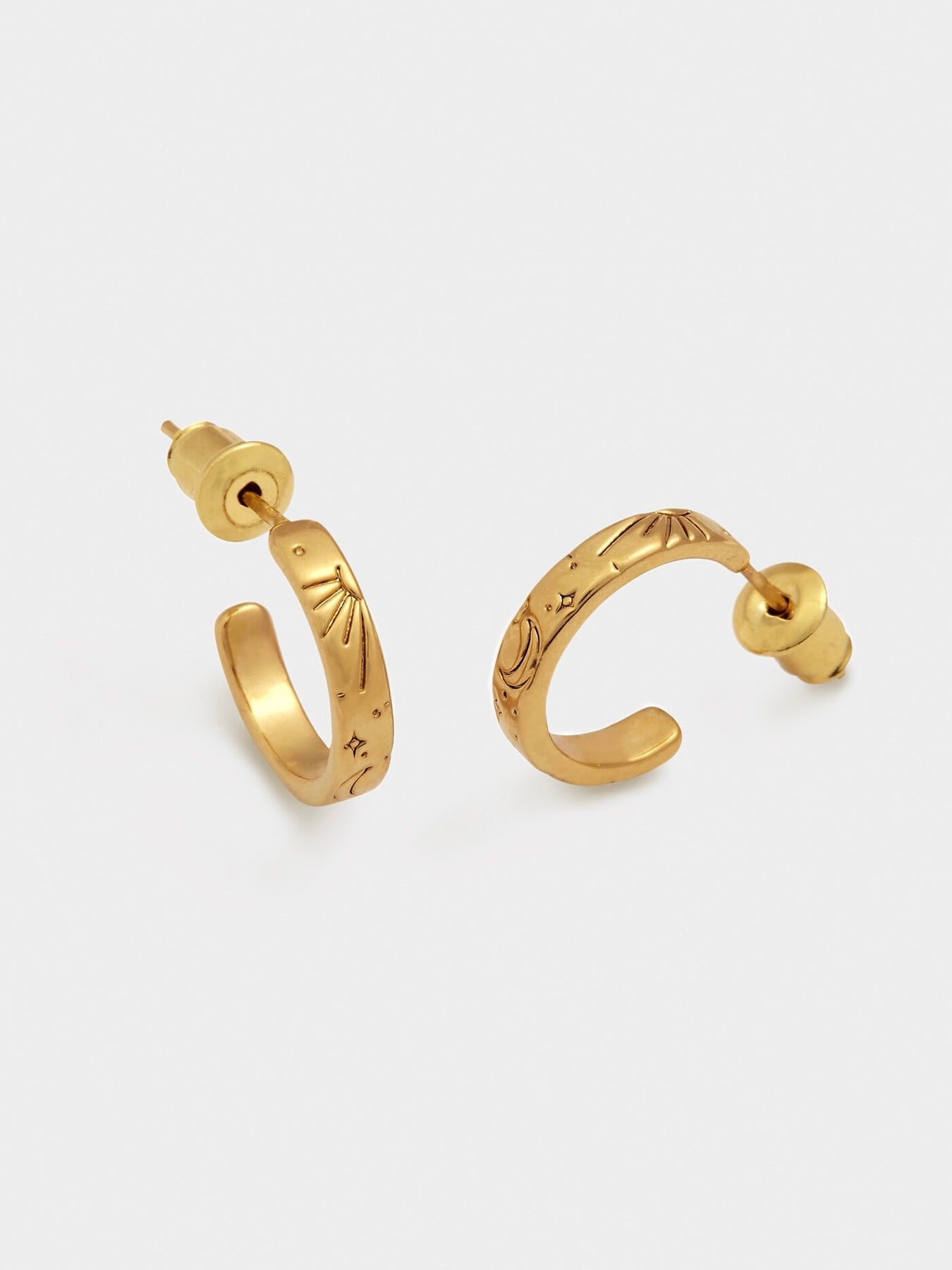 Style: Feature a captivating engraved celestial design. We love these solo or layered with other hoops or post earrings. 1.5" diameter. Pushback closure.