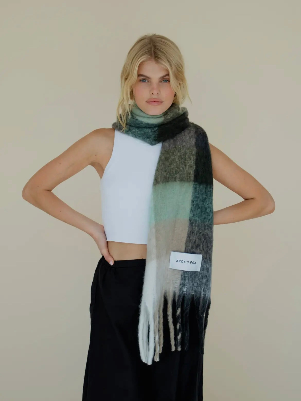 Style: Super-soft brushed texture. Features fringed ends and an extra-large silhouette. Construction and brush cycles on the machines engineered to minimize any potential pilling. • Brushed an extensive six times compared to the industry standard of four, the result is a thicker, warmer, ‘fluffier’ texture. One Size: 215cm x 40cm.
