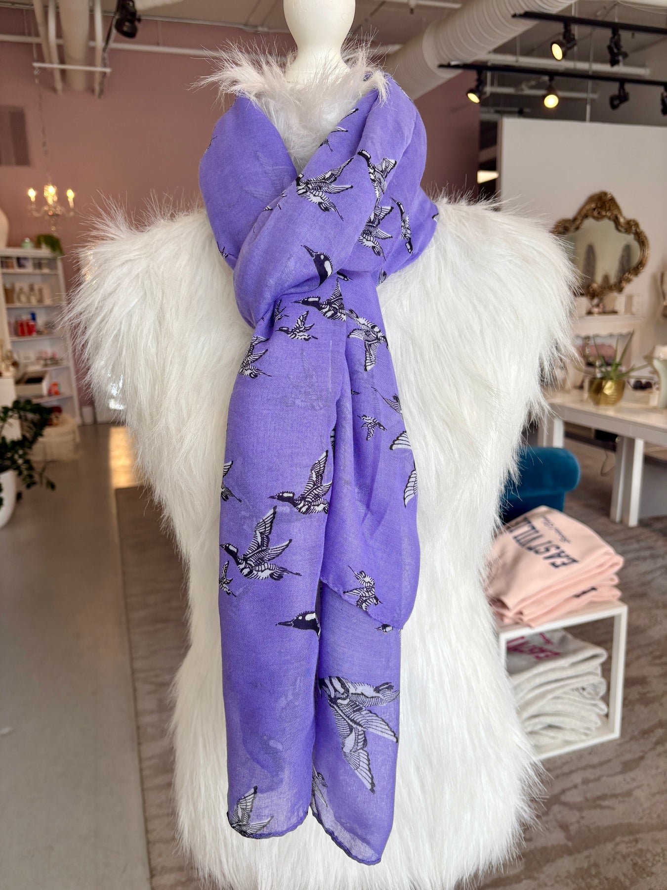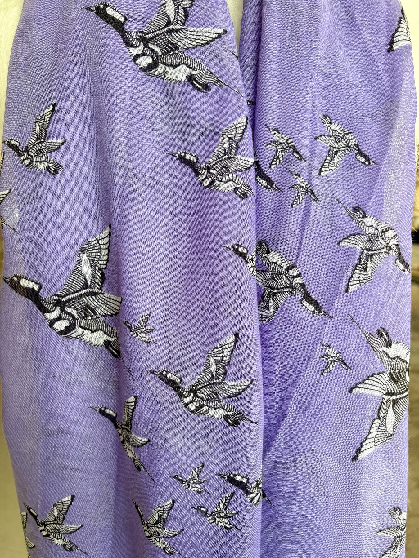 Style: Effortlessly chic with a nature-inspired twist -- this gorgeous Printed Village periwinkle scarf features beautifully detailed black and white Hooded Merganser ducks in flight scattered across a dreamy lavender background. We love it against dark colors like blacks and navy.