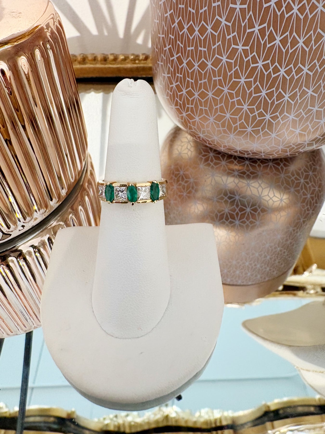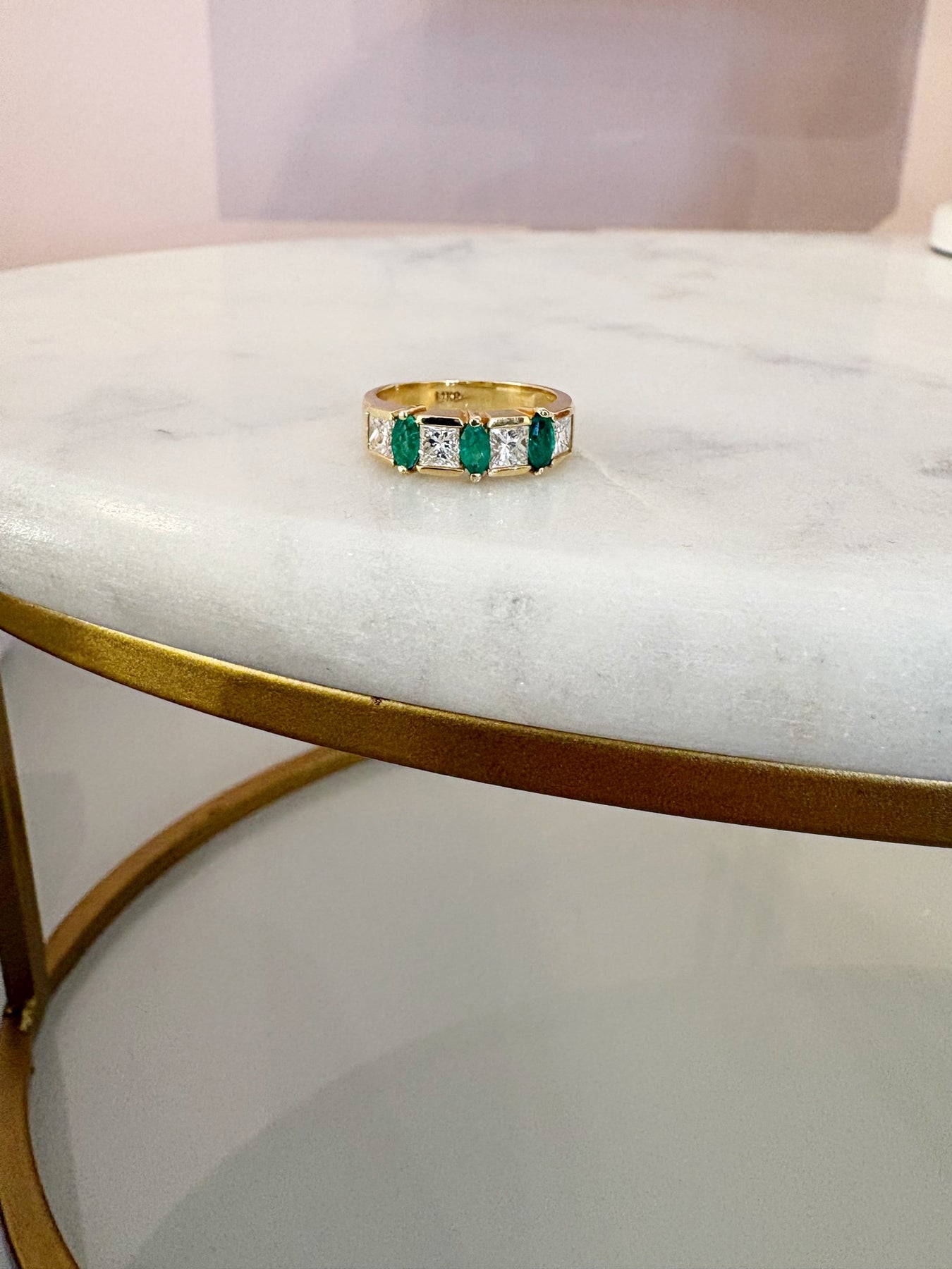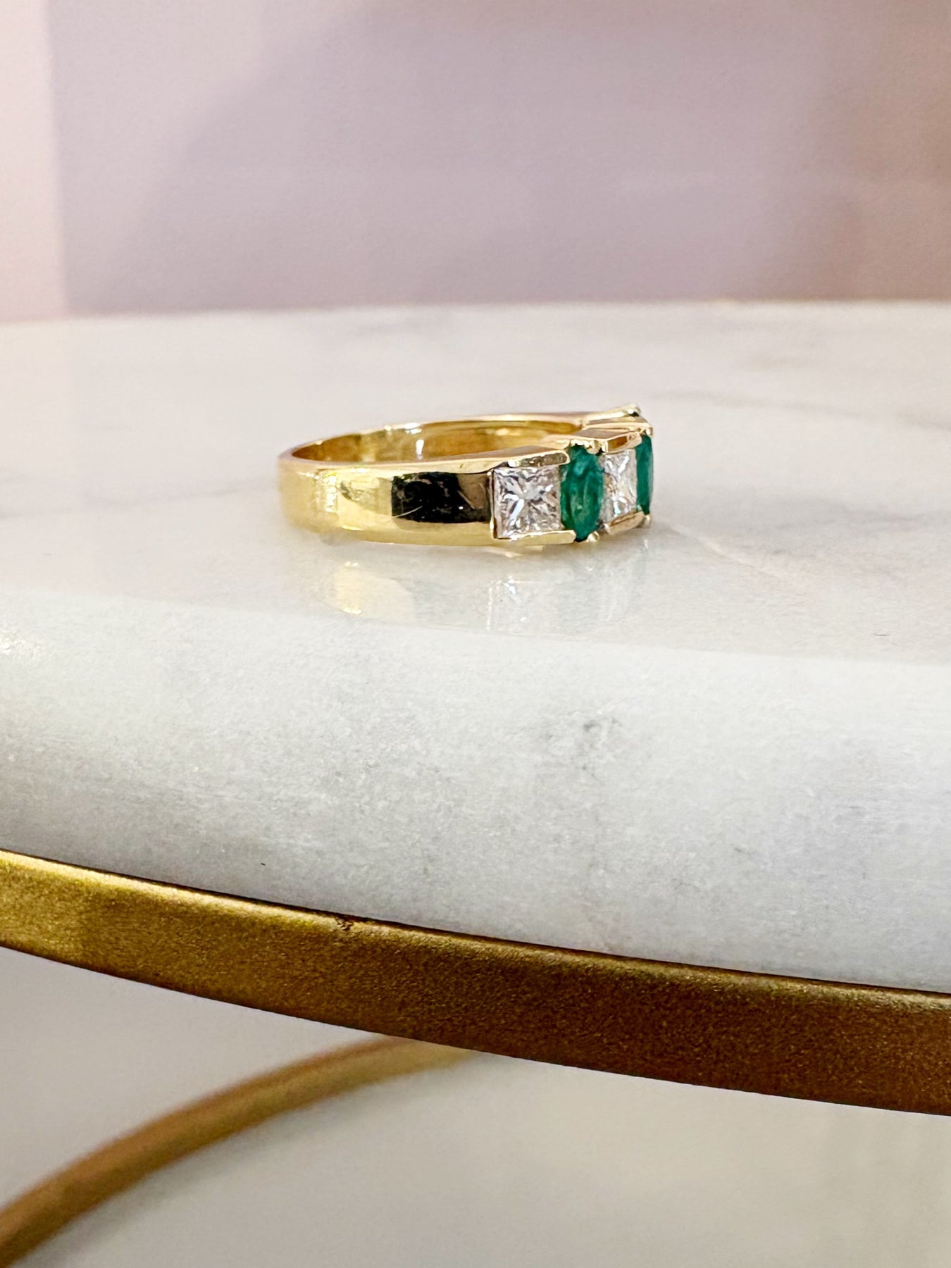 Style: A timeless beauty with a bold presence! This 14k yellow gold band features three rich green Emeralds set vertically between sparkling princess cut diamonds. Perfect as a statement band, anniversary band or stacked with your favorite gold pieces. This Estate ring is a size 6.