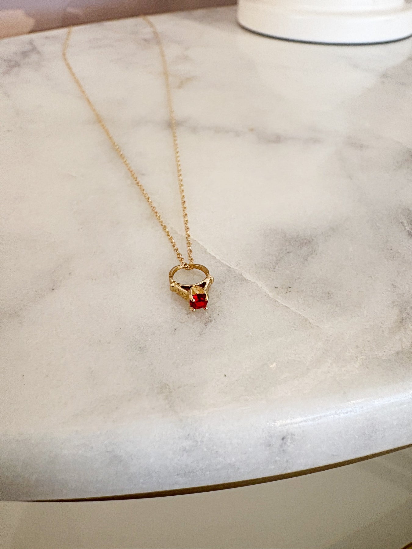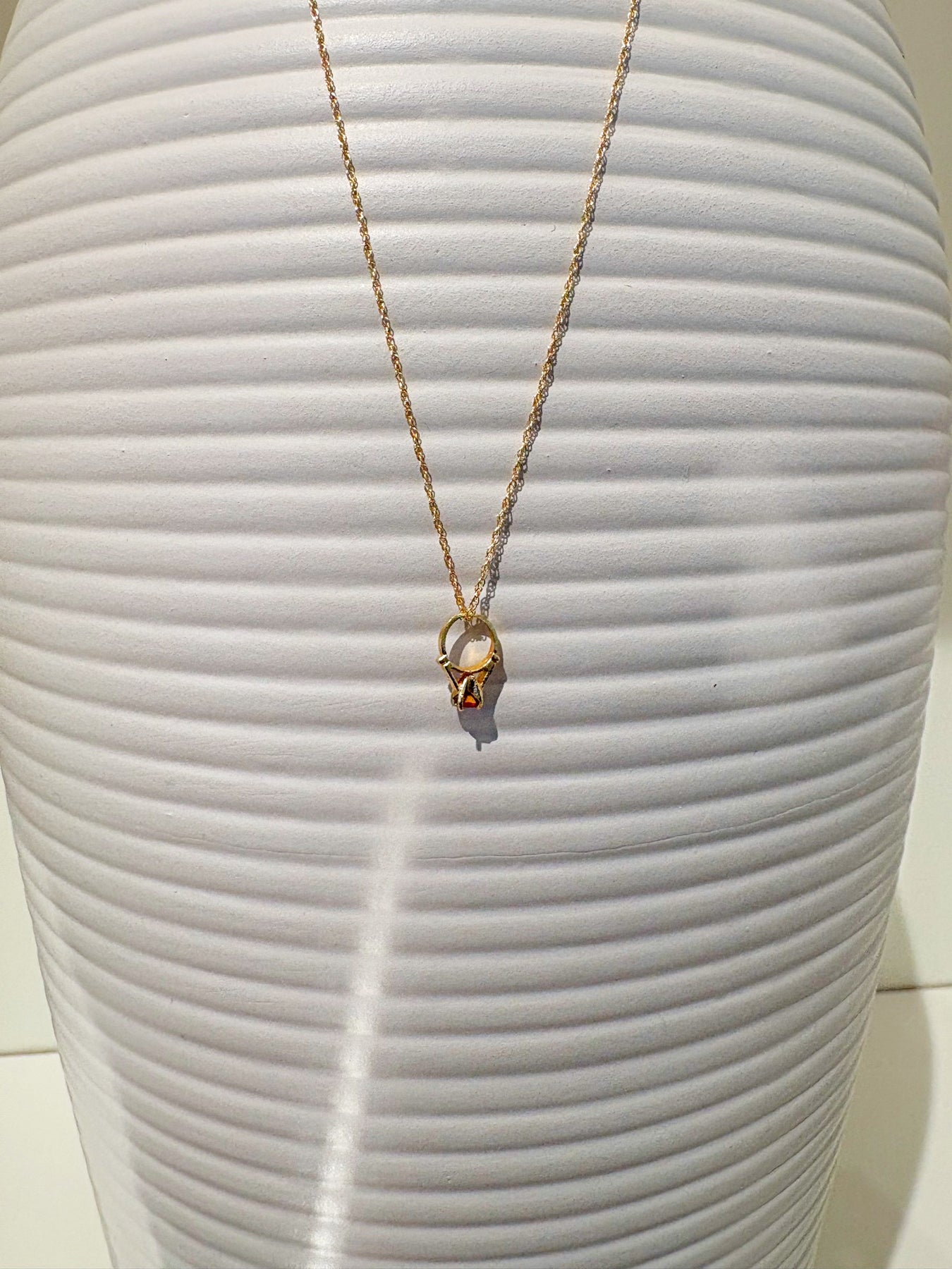 Style: How sweet is this?! A darling estate ring charm pendant featuring a vibrant red stone set in prongs on a miniature ring shaped charm, all in warm yellow gold. It hangs delicately from a brand new sparkle chain, giving it that perfect mix of vintage soul and fresh wearability. Petite, charming, and full of personality — this one is a total conversation starter. A wonderful gift for an estate lover or anyone who appreciates something truly unique and sentimental!