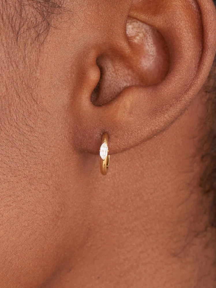 Style: Taking your huggie game up a notch, why not add some shimmering sparkle to your ear stack with these stunning hoops? The smooth mini hoop is embellished with a unique-shaped faceted rhinestone, serving up a modern twist on everyone’s favorite ear stack essential. Style yours with big hoops or drop earrings for a statement look. 12mm diameter. Click-back closure.
