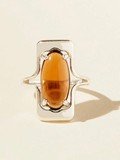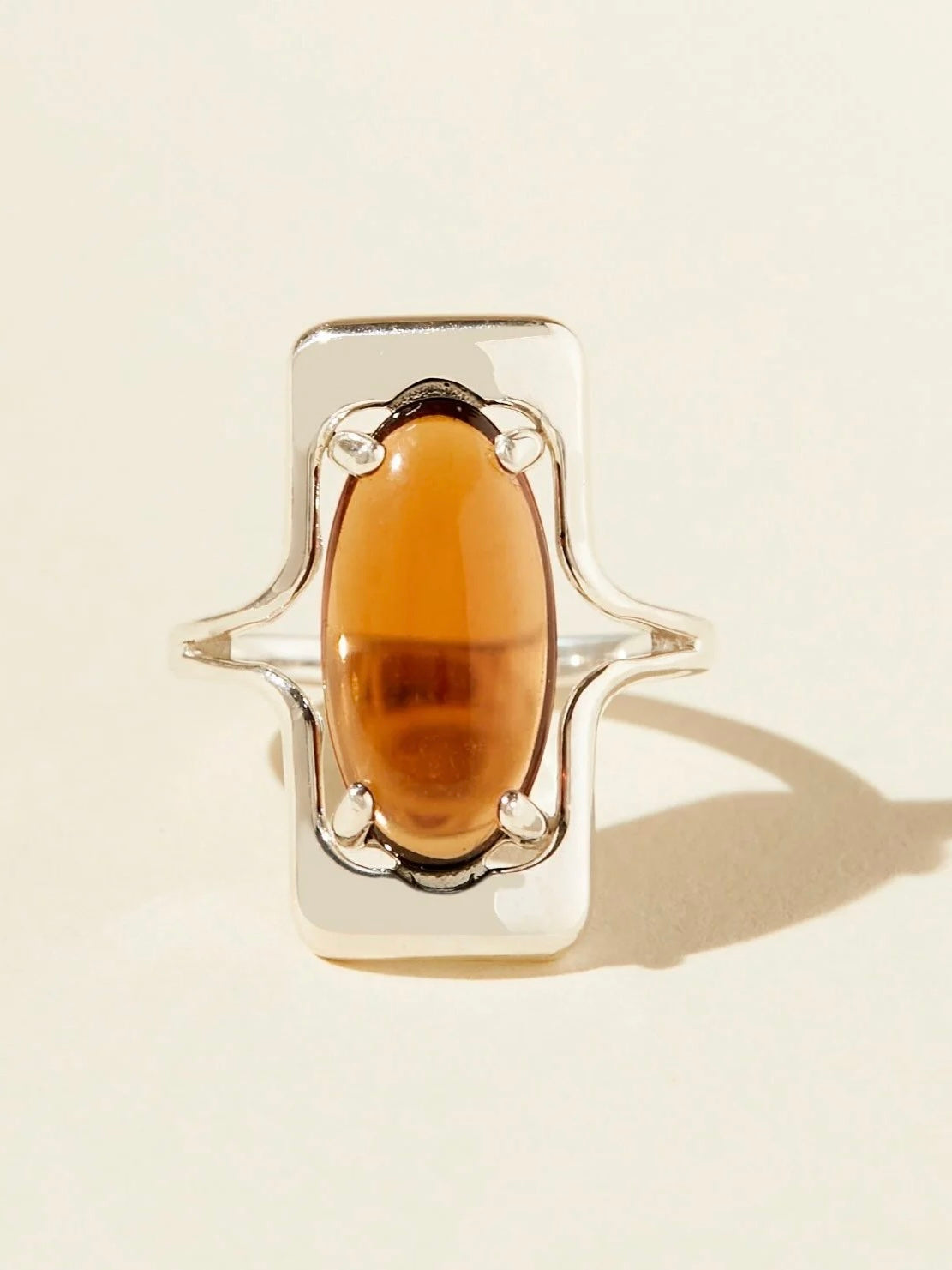 Style: Your new favorite statement ring. A large, long oval, glass cabochon sits in the middle of a soft rectangular design. Low profile and easy to wear. Top rectangle measures 1” x .5”.